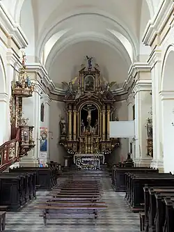 Na przedłużeniu głównej nawy znajduje się prezbiterium z głównym ołtarzem, oddzielone od reszty kościoła kamienną balustradą. W centrum bogato zdobionego ołtarza znajduje się krucyfiks z postaciami Matki Bożej i św. Jana, a także figury świętych Augustyna i Ambrożego[2]. Z obu stron prezbiterium znajdują się drzwi do zakrystii. Nad jednymi z nich wisi obraz Świętej Rodziny z I połowy XVI wieku, a nad drugimi obraz „Uczniowie z Emaus”, prawdopodobnie autorstwa Jana Styki. Do najcenniejszych zabytków znajdujących się w zakrystii należy ornat z XV wieku. Przedstawia on sceny: Adoracji Dzieciątka, Zwiastowania, Ofiarowania w świątyni. Przed prezbiterium znajduje się kamienna chrzcielnica.