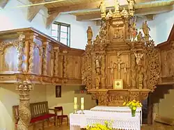 Ołtarz pochodzi z około 1700 roku i został wykonany w stylu barokowym w formie rozbudowanej 2-kondygnacyjnej i 3-osiowej nadstawie. Pole środkowe zawiera scenę Ostatniej Wieczerzy. Boki ołtarza zajmują figury Matki Boskiej i św. Jana. Całość ołtarza wieńczą symetrycznie ustawione figury: