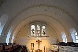 Budowla zwrócona jest elewacją frontową na stronę wschodnią, wybudowana w stylu późnoklasycystycznym z elewacją frontową o cechach neoromanizmu, na planie czworokąta, z czworoboczną dobudówką od zachodu, nakryty dwuspadowym dachem blaszanym. Elewacje boczne są podzielone pilastrami, okna są zamknięte półkoliście. Elewacja frontowa jest zamknięta przez dwa potężne filary, zakończone namiotkowymi daszkami. Na środku elewacji umieszczone jest wejście główne, ujęte w trzy arkady, a nad nim wysokie otwory okienne ujęte w potrójną arkadę, a nad nią okrągłe okno. Na szczycie fasady umieszczona jest czworokątna sygnaturka (wieżyczka), wyposażona w zegar, pokryta daszkiem z kulą i krzyżem. Wnętrze ma charakter jednoprzestrzenny. Zwraca uwagę w nim pozorne drewniane sklepienie kolebkowe. Drewniane empory (balkony) boczne oraz chór muzyczny są podparte przez żłobkowane kolumny. W oknach umieszczone są witraże z XIX wieku ukazujące Jezusa oraz Apostołów Piotra i Pawła. Sufit posiada pasy z rozet. Organy pochodzą z I połowy XIX stulecia. Balustrady empor są pełne, posiadają rozety i płyciny. Wyposażenie wnętrza pochodzi z lat współczesnych.