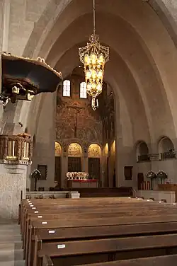 W prezbiterium znajdują się monumentalne malowidła Olle Hjortzberga (1872-1959). sztukaterie w prezbiterium oraz nad głównym wejściem opracował rzeźbiarz Tore Strindberg (1882-1968), polichromia natomiast jest dziełem Filipa Månssona. Na północ od prezbiterium znajduje się zakrystia.