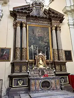 Obraz tytularny umieszczony w ołtarzu przedstawia Obrzezanie Dzieciątka Jezus, chociaż kościół jest ogólnie znany jako kościół Jezuitów z powodu powiązania z tym zakonem i kolegium. Obraz jest dziełem Filippo Paladiniego (ok. 1544–1616), włoskiego malarza, który pracował na Malcie pod koniec XVI wieku[b]. Obraz ten jest postrzegany jako jedno z najlepszych jego dzieł[24][25]. Został odnowiony na początku XX wieku[24]. Balustrada oddzielająca prezbiterium jest wspaniałym przykładem lokalnego rękodzieła artystycznego[22]. Na bocznych ścianach prezbiterium wiszą dwa duże owalne obrazy przedstawiające Świętego Jana Chrzciciela oraz Świętą Annę. Oba są dziełem Giuseppe D'Areny[26].