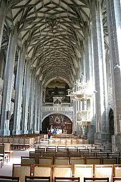 Projekt obszernej świątyni halowej z rzucającą się w oczy nawą środkową sporządził architekt miejski Caspar Crafft. Dziesięcioprzęsłowe wnętrze kościoła jest podzielone na trzy nawy równej wysokości. Ściany zostały przeprute wąskimi, gotyckimi oknami wypełnionymi maswerkiem o geometryzujących wzorach. 10 par smukłych, ośmiokątnych filarów podtrzymuje płytki, zbliżony kształtem do beczki strop, który wypełnia sklepienie sieciowe (w nawie środkowej) lub gwiaździste (w nawach bocznych). Konstrukcja nośna sklepień jest dodatkowo wzmocniona żebrami wychodzącymi bezpośrednio z filarów i poprowadzonych do żeber sklepienia w pewnej odległości od nich. Arcydziełem późnogotyckiej sztuki kamieniarskiej są kamienne wisiory, tzw. cul de lampe[b] dłuta następcy Craffta, Nickela Hoffmanna, zawieszone pod sklepieniem nawy środkowej. Do wnętrza prowadzą dwa jednakowe, ostrołukowe portale umieszczone w ścianach bocznych. Pomiędzy gęsto zbudowanymi przyporami, opinającymi z zewnątrz mury, znajdują się oddzielne, małe kaplice z II poł. XVII w., otwierające się do wnętrza kościoła.