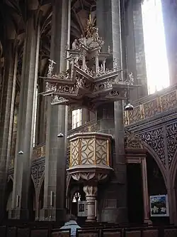 Ambona z piaskowca powstała w 1541 razem z jednym z filarów. Pochodzi z warsztatu Nickela Hoffmanna. Pierwsza jej restauracja miała miejsce już w 1666, ostatnia zaś w 1973. Jej forma jest jeszcze późnogotycka ale detale architektoniczne są już typowo renesansowe. Godny uwagi jest zwłaszcza rozbudowany, drewniany daszek akustyczny z 1596. Stanowi on znaczące osiągnięcie snycerza Heinricha Heidenreittera i malarza Heinricha Lichtenfelsera. Daszek składa się z dwóch ośmioramiennych gwiazd, ułożonych jedna nad drugą, nad którymi wznosi się trzecia, mniejsza gwiazda, wsparta na ośmiu misternych kolumienkach. Całość konstrukcji wieńczy rozbudowana scena Przemienienia Pańskiego.