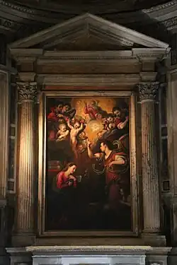 Pierwsza kaplica po lewej stronie jest poświęcona Oczyszczeniu Matki Bożej. Zarówno obraz w ołtarzu, jak i freski są autorstwa Cavaliere d'Arpino. Ołtarz pochodzi z 1627 roku, obraz w nim to Ofiarowanie w świątyni. Freski sklepienia z 1620 roku przedstawiają świętych Ambrożego, Monikę i Augustyna[2].