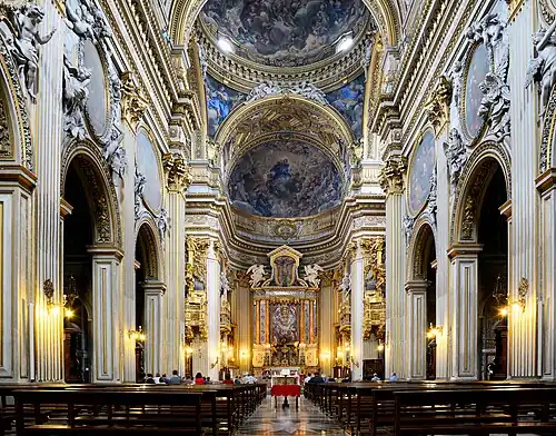 Kościół zbudowano na planie krzyża łacińskiego. Jest on trzynawowy, z szeroką nawą główną i krótkim transeptem. Przy każdej z naw bocznych umieszczono po pięć kaplic bocznych. Na skrzyżowaniu nawy z transeptem umieszczono kopułę. Apsyda jest trójboczna, otoczona dwiema dużymi kaplicami.