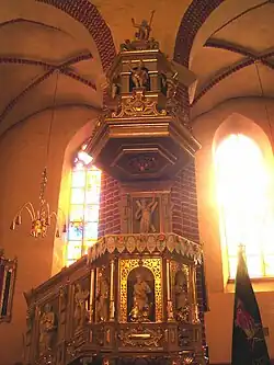 Późnorenesansowa ambona z 1623 roku zdobiona jest w figury Świętych Apostołów i Ewangelistów, tych zaś ostatnich otaczają dodatkowo złote motywy roślinne. Poza postaciami Apostołów i Ewangelistów, które znajdują się na balustradzie kazalnicy (ambony), pojawiają się także figury i płaskorzeźby aniołów oraz rzeźba Chrystusa, którego prawa ręka wzniesiona jest wysoko ku górze, lewa zaś trzyma krzyż.