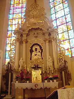 XVIII-wieczny, barokowy ołtarz Matki Boskiej Częstochowskiej został przywieziony z kościoła w Legnickim Polu po II wojnie światowej. Ponad tabernakulum, na ołtarzu kościoła znajduje się, otoczony złoconymi motywami roślinnymi, obraz z wizerunkiem Matki Bożej Częstochowskiej – ku niemu zaś skierowane są dwie postacie kobiece, z których każda umieszczona jest pomiędzy dwoma kolumnami. Pierwsza przedstawiona jest w pozie ukazującej zachwyt, podziw – jedną ręką dotyka ona piersi a głowa jej uniesiona jest ku górze. Druga postać przedstawiona jest w modlitewnej pozie orantki – ma ona wzniesione lekko ku górze ręce. Ponad obrazem znajduje się niewielkich rozmiarów rzeźba pelikana karmiącego swą krwią pisklęta, będąca symbolicznym przedstawieniem Eucharystii, wyżej zaś, znak Boga Trójjedynego – trójkąt otoczony promieniami z wpisanym nań Imieniem Bożym.