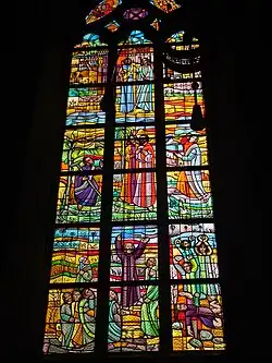 W prawej południowej nawie znajdują się trzy witraże. Na pierwszym z nich przedstawiono wydarzenia ewangeliczne, mianowicie: powołanie uczniów; cudowny połów ryb; rozmnożenie chleba. Na drugim ukazano wydarzenia, o których czytamy w Dziejach Apostolskich: uzdrowienie chromego przez Apostołów Piotra i Jana; wystąpienie św. Szczepana oraz męczeńską jego śmierć; na trzecim zaś nawrócenie Szawła oraz udzielanie chrztu i przekazywanie Ducha Świętego przez nakładanie rąk. W lewej północnej nawie, gdzie mieści się kaplica św. Barbary – patronki górników, znajduje się witraż, na którym przedstawiono m.in. wspomnianą świętą, jej nawrócenie i męczeńską śmierć oraz herb górniczego miasta Lubina.