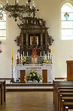 Wewnątrz świątyni znajdują się: renesansowy ołtarz z 1618 roku (w nadbudowie mieszczą się malowidła: „Ostatnia Wieczerza”, „Złożenie do grobu” oraz wizerunki św. Piotra i Pawła), ambona, chrzcielnica z 1593 roku oraz balustrada chóru z 1700 roku[4].