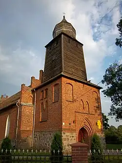 Jednonawowy kościół o wydłużonym korpusie z wieżą oraz szczytami schodkowymi. Ściany osadzone są na podmurówce z kamienia polnego. Sam kościół jest murowany, z cegły. Dach przykrywający kościół jest dwuspadowy, natomiast wieża pokryta jest drewnem. Jej szczyt zwieńczony jest pękatym hełmem dzwonowym, a kopuła kryta jest gontem. Wnętrze skrywa gotyckie portale i późnorenesansowy ołtarz[2][3].