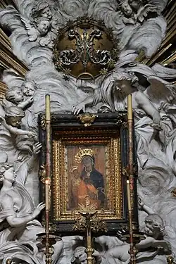 W ołtarzu głównym znajduje się XIII-wieczny wizerunek Matki Bożej z Dzieciątkiem, ujęty w barokową glorię umieszczoną w absydzie pomiędzy parą półkolumn kompozytowych z brązu. Gloria składa się z grupy aniołów ze stiuku podtrzymujących obraz, za nimi znajdują się złocone promienie. Sam obraz jest utrzymany w tradycji ikonograficznej Hodegetrii, z tym że Dzieciątko nietypowo znajduje się po prawej stronie Maryi. Na pilastrach przy prezbiterium umieszczono parę brązowych dwugłowych orłów[2].