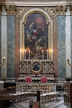 Wnętrze jest nieco eliptyczne. Istnieje sześć małych kaplic bocznych, cztery oryginalne znajdują się na przekątnych, natomiast dwie po bokach zajmują oryginalne wejścia boczne. Wnętrze jest bogato zdobione polichromowanym marmurem i złoconym stiukiem, w dużej mierze jest to efekt renowacji z XIX wieku[2].
