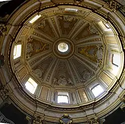 Bęben kopuły od wewnątrz ma osiem dużych okien ze zdobionymi złoconymi ramami, które są oddzielone płytkimi pilastrami wyłożonymi polichromowanym marmurem. Sama kopuła jest żebrowana. W oculusie umieszczono symbol Trójcy Świętej. Osiem sektorów wnętrza kopuły zdobią białe i złote sztukaterie, girlandy i liście palmowe. U dołu każdego sektora umieszczono tondo wspierane przez anioły i zawierające płaskorzeźbę przedstawiającą scenę z życia Maryi[2].