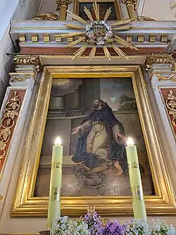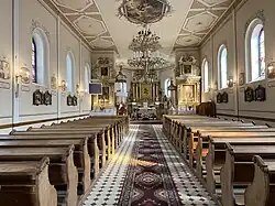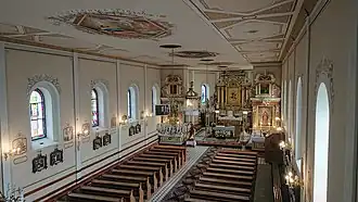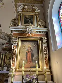 W nawie głównej znajdują się dwa drewniane ołtarze boczne – w prawym obraz Matki Boskiej ze św. Dominikiem, zasłaniany przedstawieniem Serca Jezusowego, w lewym obraz św. Rocha, zasłaniany przedstawieniem św. Józefa[6].