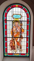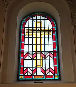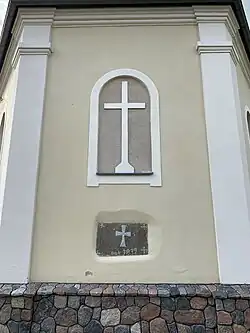 - ↑ Wykorzystanie motywu wycinanki kurpiowskiej potwierdzają podpisy na witrażach, przykład dostępny jest w Wikimedia Commons.