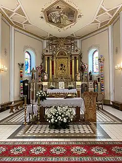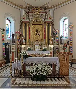 W prezbiterium umieszczony jest drewniany ołtarz główny, w którym znajduje się obraz Matki Boskiej Częstochowskiej, zasłaniany obrazem Przemienienia Pańskiego lub św. Mikołaja. Na bocznych krawędziach ołtarza stoją figury św. Wojciecha oraz św. Stanisława[6].