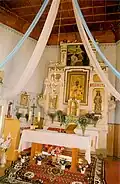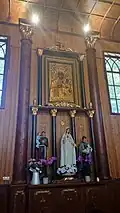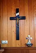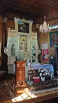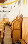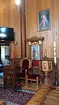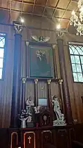 Ściany wewnętrzne są szalowane. Na wysokość 1,6 m obłożone pionową boazerię. Sufit, nawy i prezbiterium są wykonane z drewnianej sklejki, listwowane w kwadraty z fasetą. W kościele ustawiono drewniane ławki z oparciami[8].