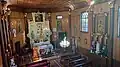 Drzwi do nawy są drewniane, dwuskrzydłowe i płycinowe. Podłoga wewnątrz wykonana została z desek (z wyjątkiem prezbiterium, które wyłożone jest dębową klepką). Drzwi do składzika i zakrystii są jednoskrzydłowe i płycinowe. Wszystkie okna są drewniane i pojedyncze: nad wejściem głównym trójdzielne wielopolowe z prostokątnym nadświetlem, nad którym znajduje się trójkątny świetlik (oba wypełnione kolorowym szkłem), pozostałe okna dwudzielne wielopolowe z nadświetlem jak w oknie nad wejściem głównym. Na chór muzyczny prowadzą dwubiegowe drewniane schody. Chór postawiono na podciągu z drewnianej belki, którą osadzono w ścianach i podparto dwoma słupami. Chór jest balkonowy[8].