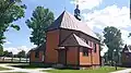 Krokwiowo-jętkowa więźba dachowa jest oparta na stolcach z zastrzałami. Niski fundament stanowią kamienie polne[8]. Prezbiterium nie zostało wyodrębnione. Jest zamknięte trójbocznie[2]. Do nawy dobudowano kruchtę (od strony południowo-wschodniej) oraz zakrystię (od strony południowo-zachodniej). Jednokalenicowy dach jest dwuspadowy nad nawą i prezbiterium, nad frontem trójspadowy. Kruchta i zakrystia przykryte są dachami pulpitowym i trójpołaciowym. Na dachu jest czworoboczna wieża (sygnaturka) o barokowej formie zwieńczona metalowym krzyżem[8]. Wejście główne od frontu osłonięte zostało daszkiem[2]. Przed wizytacją biskupią w 1935 kościół został oszalowany deskami zewnątrz i wewnątrz[9].