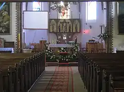 Ołtarz główny, w formie tryptyku, mieści drewniane figury: w centrum krzyż z postacią Chrystusa, otoczony rzeźbami Matki Boskiej Bolesnej i św. Jana Apostoła. Skrzydła ołtarza przedstawiają świętych. Tabernakulum ozdobione jest symbolem kielicha, hostii i motywami roślinnymi[3].