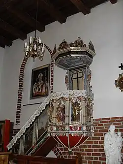 We wnętrzu kościoła znajduje się XVII-wieczny ołtarz, ambona i chrzcielnica. Od czasów reformacji, aż do 1945 r. zabytek znajdował się w rękach wyznawców religii protestanckiej. Opodal wzgórza kościelnego Dzwonnik znajduje się studnia, przy której św. Otton z Bambergu udzielał chrztu w latach 1124–1125. Na terenie przykościelnym znajduje się drewniany krzyż na kamiennym postumencie, najprawdopodobniej z XIX wieku[2] oraz figura Jezusa Miłosiernego. Niedaleko kościoła opodal wzgórza kościelnego Dzwonnik znajduje się znajduje się studnia, przy której św. Otton z Bambergu miał udzielać chrztu w latach 1124–1125[2].