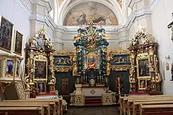 Główne miejsce zajmuje obraz Matki Boskiej Bolesnej, trzymającej ciało Jezusa. Obraz ten zasłonięty jest przez inny z wizerunkiem Maryi z dzieciątkiem Jezus, która wręcza błogosławionemu Szymonowi Stockowi szkaplerz. Na wstędze jest napis, który głosi po łacinie „Kto umrze z tym szkaplerzem, nie będzie cierpiał ognia wiecznego”[5].