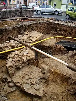 Teren prac archeologicznych na dawnym placu Marii Panny. W tle kamienica Ramerówka. | |