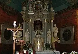 Postać św. Jana Nepomucena występuje aż 4-krotnie. Ołtarz główny i ambona są późnobarokowe i pochodzą z XVIII wieku. Na ambonie umieszczono rzeźbę Jezusa Chrystusa[4]. W ołtarzu umieszczony jest obraz Matki Boskiej Częstochowskiej[6].