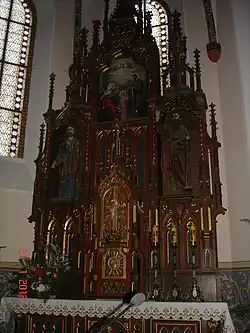 W kościele znajdują się cztery ołtarze: główny, dwa po bokach prezbiterium i jeden w kaplicy bocznej.