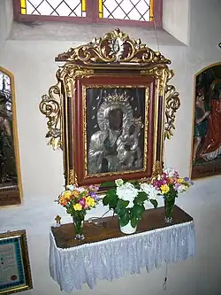 Ze starego drewnianego kościoła zachowały się dwa obrazy. Barokowy obraz św. Antoniego pochodzący z około połowy XVIII wieku w ramie akantowej, który obecnie znajduje się pod chórem. Drugi obraz przedstawia Matkę Boską Częstochowską w metalowych sukienkach pochodzący prawdopodobnie z XVIII wieku i umieszczony obecnie w nawie bocznej. Na strychu świątyni znajduje się również kilka uszkodzonych rzeźb barokowych również pochodzących ze starego kościoła. Oprócz tego zachował się relikwiarz Krzyża w formie krzyża i złocony z 1760 r., kielich mszalny z 1761 r., księga chrztów od 1760 r., ślubów od 1766 r. i zgonów od 1898 r., dzwon odlany przez F. Schillinga w Apoldzie z XIX wieku[17].