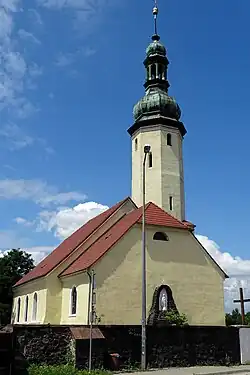 Świątynia jest jednonawowa, zamknięta od strony wschodniej jest prostokątnym prezbiterium, do którego od północnej strony jest dobudowana zakrystia. Przy północno-wschodnim narożniku nawy jest dobudowana wieża, kwadratowa w przyziemiu, a powyżej ośmioboczna, nakryta baniastym dachem hełmowym, na którym jest umieszczona latarnia. Świątynię nakrywa dach naczółkowy wykonany w 1832 roku. Do nawy od strony północnej jest dobudowana kaplica grobowa von Eberhardów pochodząca z początku XVI wieku. Kościół posiada drewniany strop. We wnętrzu, dookoła nawy, są umieszczone empory w stylu klasycystycznym z 1832 roku, podparte drewnianymi kolumnami.
