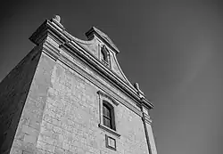 Fasada świątyni jest typowa dla tego rodzaju budynków w XVII wieku. Na rogach znajdują się dwa wysokie doryckie pilastry podpierające belkowanie rozpięte na całą szerokość ściany. Na gzymsie spływy wolutowe, zwieńczone centralnie trójkątnym frontonem z krzyżem na szczycie, dołem dochodzące do elementów architektonicznych w formie szyszki. Poniżej frontonu nisza lub zamurowany otwór, mogący w przeszłości być niewielką dzwonnicą łukową. Ponad centralnie usytuowanymi drzwiami, otoczonymi kamiennym profilem, półkolisty fronton. Powyżej tablica z inskrypcją, dziś już trudną do odczytania, informująca o wizycie biskupa D’Astirii w latach 70. XVII wieku. Ponad nią, poniżej gzymsu, prostokątne okno zakończone lekkim łukiem, otoczone prostą ramą[2][4][8].