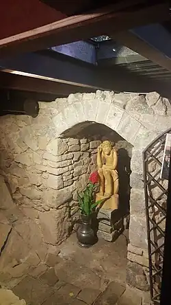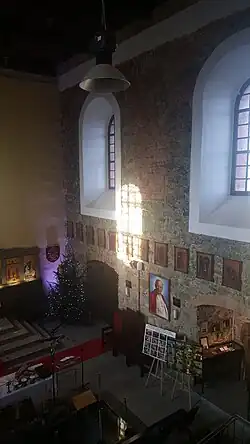 - ↑ Obecnie fragmenty murów średniowiecznego zamku można oglądać przez szklaną szybę w posadce kościoła.