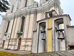 Od strony północnej kościoła stoi współczesny, piętrowy budynek klasztorny. Od frontu oraz strony zachodniej świątynię i klasztor otacza cmentarz kościelny odgrodzony od ulicy ażurowym ogrodzeniem z trójprzęsłową bramą (w południowo-wschodnim narożu nekropolii zbudowano współczesną kostnicę z dzwonnicą). Zabudowania gospodarcze i ogrody istniały dawniej na północ i wschód od budynków konwentu[1].