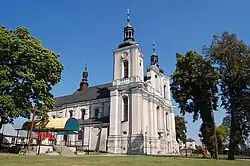Kościół jest murowaną, trójnawową, orientowaną bazyliką. Jest długi na 65 metrów, szeroki na 30 metrów i wysoki na 15 metrów[2]. Jego powierzchnia wynosi 1206 m², a kubatura 26 532 m³[3]. Nawa główna jest pięcioprzęsłowa, prezbiterium trójprzęsłowe, zamknięte prostopadłą ścianą, węższe od nawy, oddzielone odeń łukiem tęczowym. Prezbiterium i nawę przykrywa sklepienie kolebkowe z lunetami. Nawy boczne, niższe od głównej o ⅓, przykrywa sklepienie krzyżowe. Są one oddzielone od nawy głównej czterema parami arkad półkolistych. Podział pionowy nawy głównej i prezbiterium wyznaczają zdwojone pilastry toskańskie. W prezbiterium znajduje się sześć okien zamkniętych łukiem odcinkowym, a w nawie głównej osiem (w lunetach sklepienia). Do prezbiterium od północy przylega prostokątna przybudówka mieszcząca zakrystię od wschodu i kaplicę Chrystusa Ukrzyżowanego od zachodu. Przy południowej ścianie urządzono zadaszone zejście do krypt. Dekoracja bocznych ścian zewnętrznych jest skromna. W kilku miejscach występują szkarpy. Fasada frontowa (zachodnia) jest dynamiczna, trzyosiowa z drzwiami zamkniętymi łukiem koszowym w cokole. Pomiędzy wieżami fasady znajduje się okno z powojennym witrażem[2].