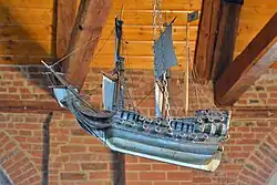 - okazały model z 1909, żaglowca Kolumbia, z 1668,, zawieszony wg legendy jako wotum za ocalenie podczas sztormu na Zalewie Szczecińskim,