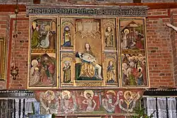 W prezbiterium uwagę przyciąga drewniany ołtarz z XVI wieku (częściowo zrekonstruowany po kradzieży[7]), z centralną rzeźbą Matki Boskiej Bolesnej[5]. Skrzydła tryptyku przedstawiają sceny z życia Maryi: zwiastowanie, narodzenie Pana Jezusa, pokłon Trzech Króli i zaśnięcie Matki Boskiej[5]. W predelli wizerunki czterech Świętych Ojców Kościoła: Ambrożego, Grzegorza Wielkiego, Hieronima i Augustyna[5]. Na zewnętrznej stronie skrzydeł sceny z Męki Pańskiej. Nad prezbiterium zawieszono votum w formie okrętu[5]. Po bokach ołtarza jest parawan wydzielający przestrzeń zakrystii zdobiony scenami biblijnymi.