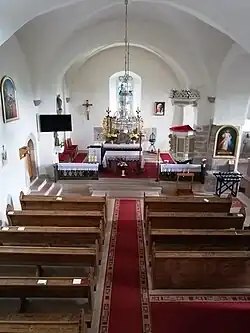 Do cenniejszych detali należą też dwa portale kamienne; jeden późnogotycki, ostrołukowy, z obramieniem uskokowym (wewnątrz kościoła); drugi – renesansowy, posiada w nadprożu o formie gzymsu z piaskowca inskrypcję: „PAX SIT INTRANTI SALVS EXEVNTIBVS”. Z wyposażenia wnętrza zwracają uwagę drewniane: barokowy XVII/XVIII w. ołtarz, figura Matki Boskiej z XVIII w., manierystyczna ambona z l poł. XVII w. oraz w dużej partii – późnorenesansowa empora, o zniekształconym dziś układzie i wielkości[5].