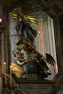 Ołtarz kolejnej kaplicy, dedykowanej św. Mikołajowi z Tolentino (Cappella di San Nicola da Tolentino), był wielokrotnie przerabiany: pierwotnie znajdował się w nim obraz Pioli (później zagubiony), a obecnie – wykonana w drewnie grupa rzeźbiarska Św. Mikołaj, dłuta Agostina Storace, ucznia Antona Marii Maragliana, z około 1760–1770 roku, przemalowana gruntownie w XIX wieku. Na ścianie, w głębi kaplicy, w surowej scenerii umieszczono postacie dziewczyny i diabła z kulą ziemską[18]. W bocznych niszach stoją stiukowe, XIX-wieczne posągi Św. Wilhelm i Św. Helena. Sklepienie zdobi fresk Giovanniego Quinzia, Zaśnięcie św. Mikołaja[17].