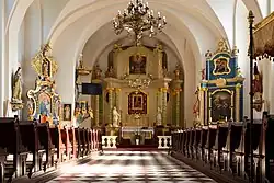 Kościół posiada sklepienie kolebkowo-krzyżowe, wsparte na rzędzie filarów. Prezbiterium jest oddzielone od nawy łukiem tęczowym. Wejście do nawy prowadzi przez kruchtę, w której położone są również schody wiodące na obydwie wieże oraz do wnęki organowej. Organy kościelne pochodzą z 1888. Pierwotnie przed wnękę wysunięty był obszerny chór, który w 1956 został zastąpiony nowym, węższym. Większość wyposażenia wnętrza reprezentuje styl barokowy, trzy ołtarze boczne powstały w II poł. XVIII wieku, o stulecie starszy jest ołtarz główny z cudownym obrazem maryjnym (obecnie jego kult właściwie już zanikł) otoczonym wotami (większość pochodzi z XVIII-XIX wieku). Osiemnastowieczna jest również ambona kościelna, zespół kielichów i lichtarzy oraz rzeźba Chrystusa Zmartwychwstałego. Z kolei XX wiek i styl neobarokowy reprezentuje obraz Matki Boskiej Szkaplerznej razem z ołtarzem, w którym jest umieszczony. Wnętrze utrzymane jest w kolorystyce typowej dla bożogrobców (barwy zielona, czerwona i złota), częściowo odtworzonej w 1956 przez plastyka Alojzego Gossa. Na wieżach kościelnych znajdują się trzy zabytkowe dzwony - dwa z roku 1638, jeden z 1633, oraz jeden dzwon współczesny, ufundowany w 1995.