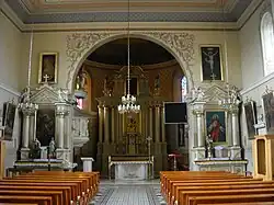 Wewnątrz budynku znajduje się 14 obrazów drogi krzyżowej, rzeźbiony konfesjonał oraz chrzcielnica starsza od kościoła - z 1860 roku.