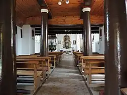 Od strony południowej znajduje się otwierająca się do nawy kaplica z nieregularnym szczytem wschodnim. Wnętrze świątyni ma interesujące wyposażenie. Jednym z jego elementów jest ambona z 1681 roku wykonana przez stolarza Richtera i rzeźbiarza Johana Christopha Dobela. Ambona była ozdobiona wyrzeźbionymi głowami konsuli. W niszy znajdowało się 6 postaci apostołów, a pod nimi głowy aniołów.
