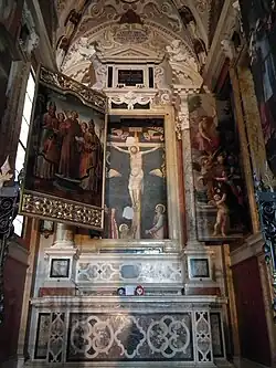 W małej apsydzie z prawej strony, na górze, znajduje się duży drewniany krucyfiks z XVIII wieku z Matką Boską Bolesną i Świętym Janem (XIV wiek). Poniżej kamienna grupa Opłakiwanie Chrystusa z II połowy XIV wieku, przypisywana Giovanniemu di Rigino[3].