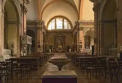 Wnętrze zbudowane jest na planie krzyża łacińskiego z sześcioma kaplicami bocznymi wzdłuż nawy (po trzy z każdej strony), sklepionymi łukowo i przedzielonymi odcinkami ciągłego muru. Nawa ma sklepienie kolebkowe[1].