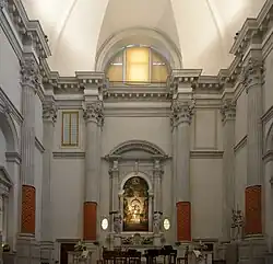 Na wewnętrznej ścianie fasady znajdują się organy, zbudowane w 1833 roku przez Bazzaniego[5].