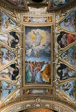 W kościele znajdują się dzieła takich mistrzów, jak: Durante Alberti (Zwiastowanie), Cesare Nebbia (Pokłon Trzech Króli i Sen św. Józefa), Girolamo Muziano (Narodzenie Pańskie), Giovanni da San Giovanni (Madonna z Dzieciątkiem i św. Karolem Boromeuszem), Antonio Viviano (kopia Piety Lorenza Sabatiniego), Paris Nogari (Droga na Kalwarię), Giovanni Battista della Marca (Zmartwychwstanie Zbawiciela), Paolo Guidotti (Zwiastowanie). Sufit świątyni zdobią freski, przedstawiające Wniebowstąpienie Pańskie, aniołów i doktorów Kościoła autorstwa Cristoforo Casolaniego. Ozdobne stiuki są dziełem Ambrogio Buonvicino. Dekoracje absydy wyszły spod pędzli Giacinto Gimignaniego i Cristoforo Casolaniego. Casolani namalował również czterech ewangelistów, zdobiących wnętrze kopuły[2].