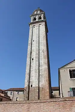 Pierwotna kampanila została zbudowana w 1290 roku. Została zniszczona przez trzęsienia ziemi w 1347, 1410 i 1511 roku. Po tym ostatnim została rozebrana i odbudowana jako wyższa w 1520 roku. W późniejszym czasie zaczęła się przechylać. W 1688 roku została wyprostowana przez Giuseppe Sardiego. W tym czasie była zwieńczona niewielką, ośmioboczną kapliczką z brązowym posągiem Najświętszej Maryi Panny z Góry Karmel. Obecny posąg jest kopią wykonaną w 1982 roku przez Romana Via, ponieważ oryginał został zniszczony w 1756 roku w wyniku uderzenia pioruna. Kampanila ma 66 m wysokości i zestaw dzwonów uruchamianych elektromechanicznie[9].