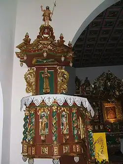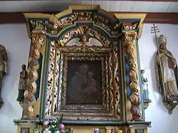 W prezbiterium po obu stronach ołtarza głównego umieszczono rzeźby dwóch świętych: Piotra i Pawła – obie barokowe pochodzące z drugiej połowy XVII wieku[2]. W lewej nawie bocznej znajduje się ołtarz, w którego centrum znajduje się obraz Matki Boskiej Nieustającej Pomocy (początek XVIII wieku)[2]. W prawej nawie bocznej eksponowany jest ołtarz, w którego centrum jest obraz Świętego Józefa z Dzieciątkiem (początek XVIII wieku)[2]. Styl barokowy z początku osiemnastego stulecia reprezentuje ambona z rzeźbami czterech ewangelistów: św. Łukasz, św. Jan, św. Marek, św. Mateusz, płaskorzeźbą św. Franciszka w zaplecku, prawdopodobnie rzeźbą świętego Franciszka Ksawerego przy wejściu i rzeźbą Chrystusa Zmartwychwstałego na baldachimie[2]. W prezbiterium stoi barokowa, z początku XVIII wieku, ława kolatorska z kartuszami herbowymi Sas (ród Sas-Jaworskich) i Groty albo Bełty (ród Wolszlegierów)[6].