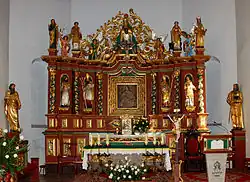Ołtarz główny reprezentuje styl późnego baroku z początku XVIII wieku. Autor dzieła jest nieznany. W centrum ołtarza znajduje się obraz Najświętszej Panny Marii Niepokalanie Poczętej (nieznanego autora) pochodzący z drugiej połowy XVII wieku. Na zasuwie umieszczono dwa obrazy: św. Walentego (XVIII w.) i Matki Boskiej Częstochowskiej (XX w.). Po bokach obrazu znajdują się trzy kręcone kolumny. Na cokołach pomiędzy nimi umieszczono rzeźby: po lewej stronie – św. Jakub Starszy, św. Wojciech, po prawej: św. Stanisław biskup, św. Wawrzyniec. W zwieńczeniu ołtarza umieszczono grupę figuralną Świętej Trójcy na tle ażurowego obramienia z liści akantu z półleżącymi aniołami. Po obu stronach Świętej Trójcy usytuowano figury świętych na cokołach i figury aniołów z kartuszami, po lewej – św. Barbara, św. Szczepan, po prawej – św. Małgorzata, św. Kazimierz Jagiellończyk, królewicz. Wymiary ołtarza to: 5,7 m – wysokość, 6,7 m – szerokość, 1,8 m – głębokość. Wszystkie elementy są wykonane z drewna pokrytego polichromią, bogato złocone i srebrzone[2].