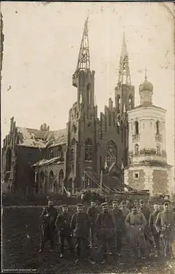 Ściany boczne, prezbiterium oraz narożniki wież i transeptu wzmacniają masywne, schodkowe szkarpy. Krawędź dachu zdobią liczne pinakle. W ścianach kościoła widać wmurowane w kilku miejscach pociski artyleryjskie z okresu I wojny światowej[4].